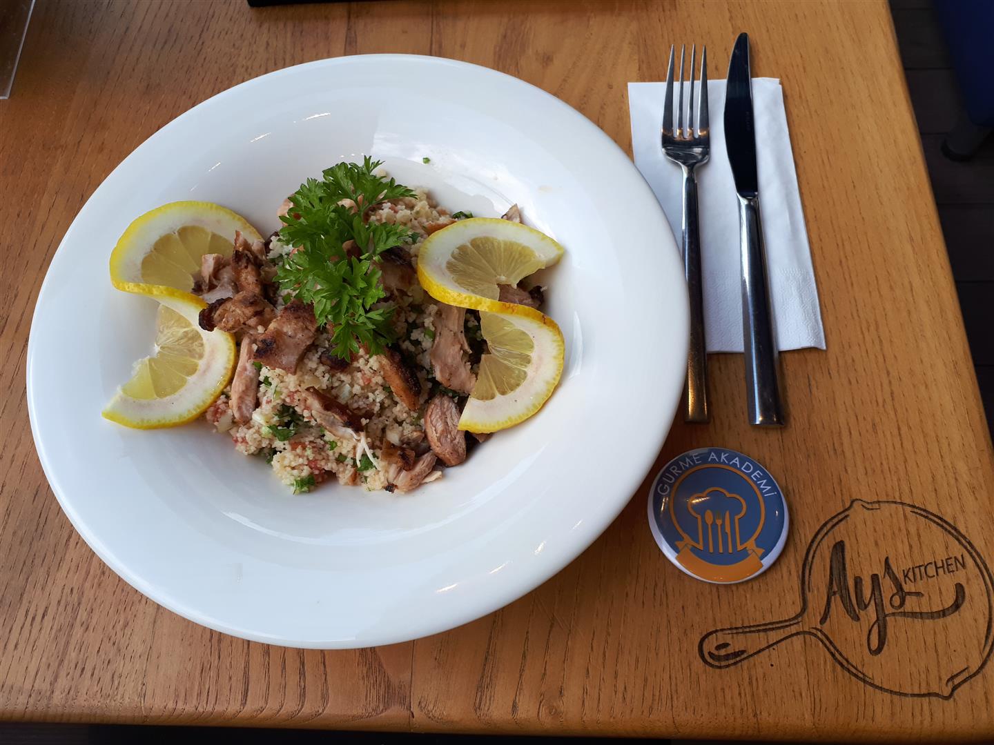 Aynı zamanda atölye (workshop) etkinlikleri, aynı zamanda kafe olarak hizmet veren Ays Kitchen'a mutlaka uğrayın. Mekanın sahibi ve isim annesi Aysun hanım çok titiz çalışmalara imza atıyor. Burada gerek yetişkinlere, gerek çocuk gruplara yönelik atölye çalışmalarına katılabilirsiniz. Arzu ederseniz yaptıklarınızı yerinde tüketebilir, arzu ederseniz paket olarak yanınıza alabilirsiniz. Bunun dışında sadece kafe olarak da gidebilirsiniz. Gayet güzel bir menüsü var. Özellikle pastaları ve tatlıları nefis. Görseldeki tabbouleh salatası da Ankara'da bulabileceğiniz nadir salatalardan biri. Atöyle (workshop) takvimi ve daha ayrıntılı bilgi için ayskitchen.com adresini ziyaret edebilirsiniz.