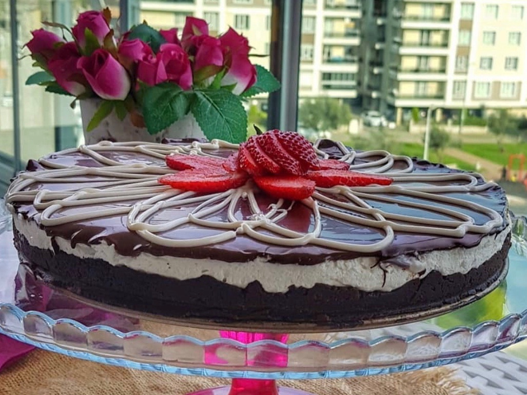 Şimdi sıra pastamızı ganaj ile kaplamaya geldi. Ganaj yapımı için; bir paket kremayı ocağın üstünde bir kaba dökün. İçine bitter çikolata ve bir yemek kaşığı tereyağı ilave edin. Arzuya göre sütlü çikolata ya da pasta malzemeleri satan bir yerden alacağınız kuvertür çikolata da kullanabilirsiniz. Sonrasında erimesi için ocağın altını açın. Tüm malzemeler eriyip, birbiriyle iyice karışınca, soğuması için bir kenara alın. Soğuma işlemi bittikten sonra kekin üzerine döküp tekrar dinlenmesi için buzdolabına kaldırın. Servis öncesi üzerini dilediğiniz gibi süsleyebilirsiniz. Ben çilekle süsledim, çok güzel oldu. Afiyetler olsun.