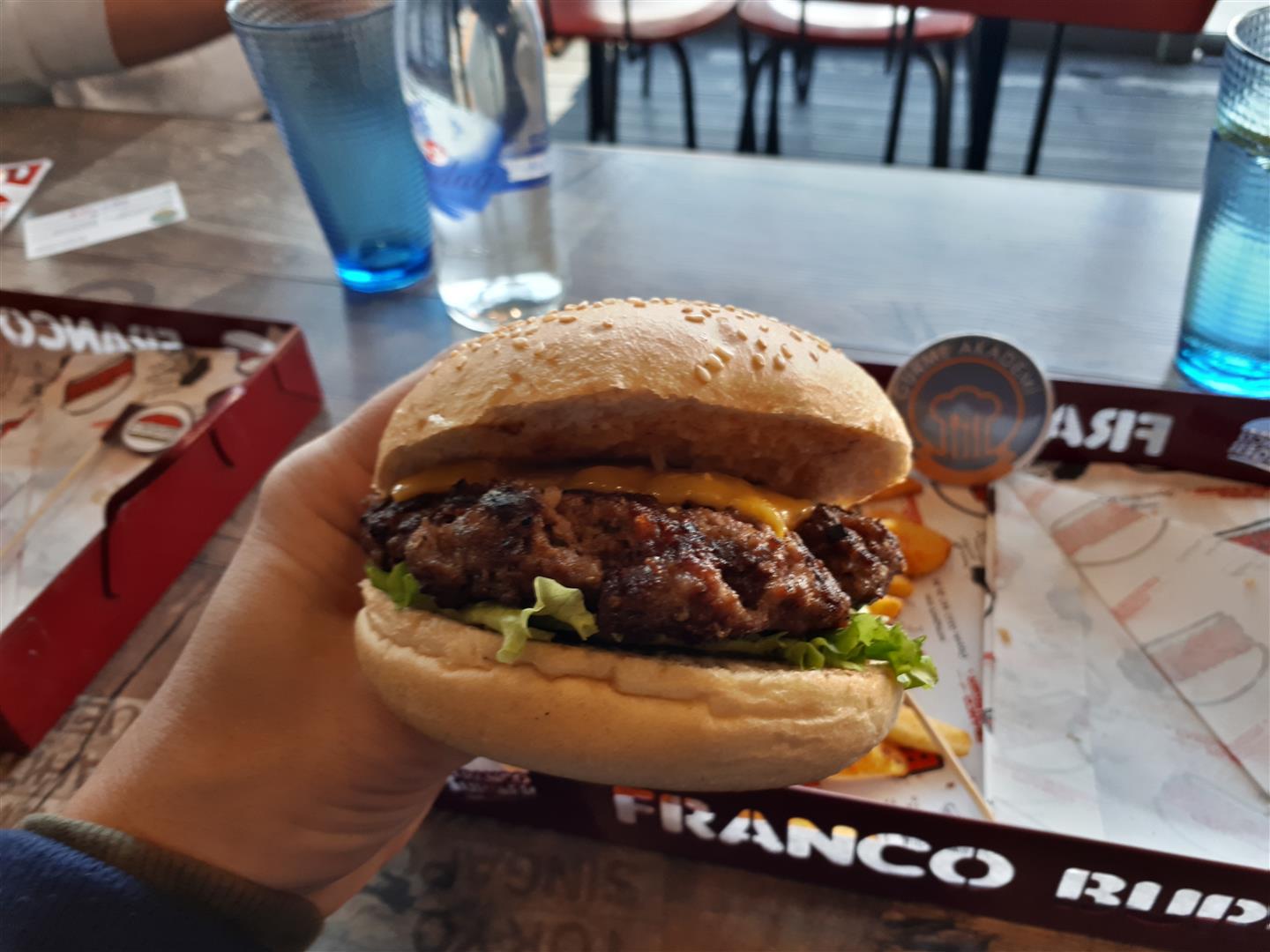 Uzun zamandır gündemimizde olan Franco Burger'le nihayet tanıştık. Bizden önce bir çok lezzet tutkunu arkadaşımız da burayı ziyaret etti ve biz de onlar gibi Franco Burger'in hamburger köftesini çok beğendik. Sadece baharatlarla lezzetlendirilmiş yüzde yüz dana eti. Canınız güzel bir burger çektiğinde aklınızda bulunsun. Gittiğinizde mekanın sahibi ve işletmecileri Ediz ve Murat beye bizden de selam söyleyin. Çayyolu Sarnıç Park'ta çok hoş, şirin bir işletme.