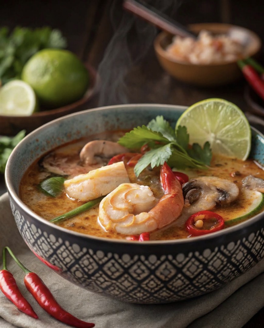 Tayland mutfağına ait bir çorbadır. Ana malzemelerini et suyu, limon yaprağı, limon suyu, limon otu, havlıcan, pul biber ve balık sosu oluşturur. Tayland dilinde “Tom” kaynama sürecini ifade eder. “Yam” ise karışık anlamına gelir. Ana malzemeleri dışında balık, karides, mantar vb. ile zenginleştirilir.